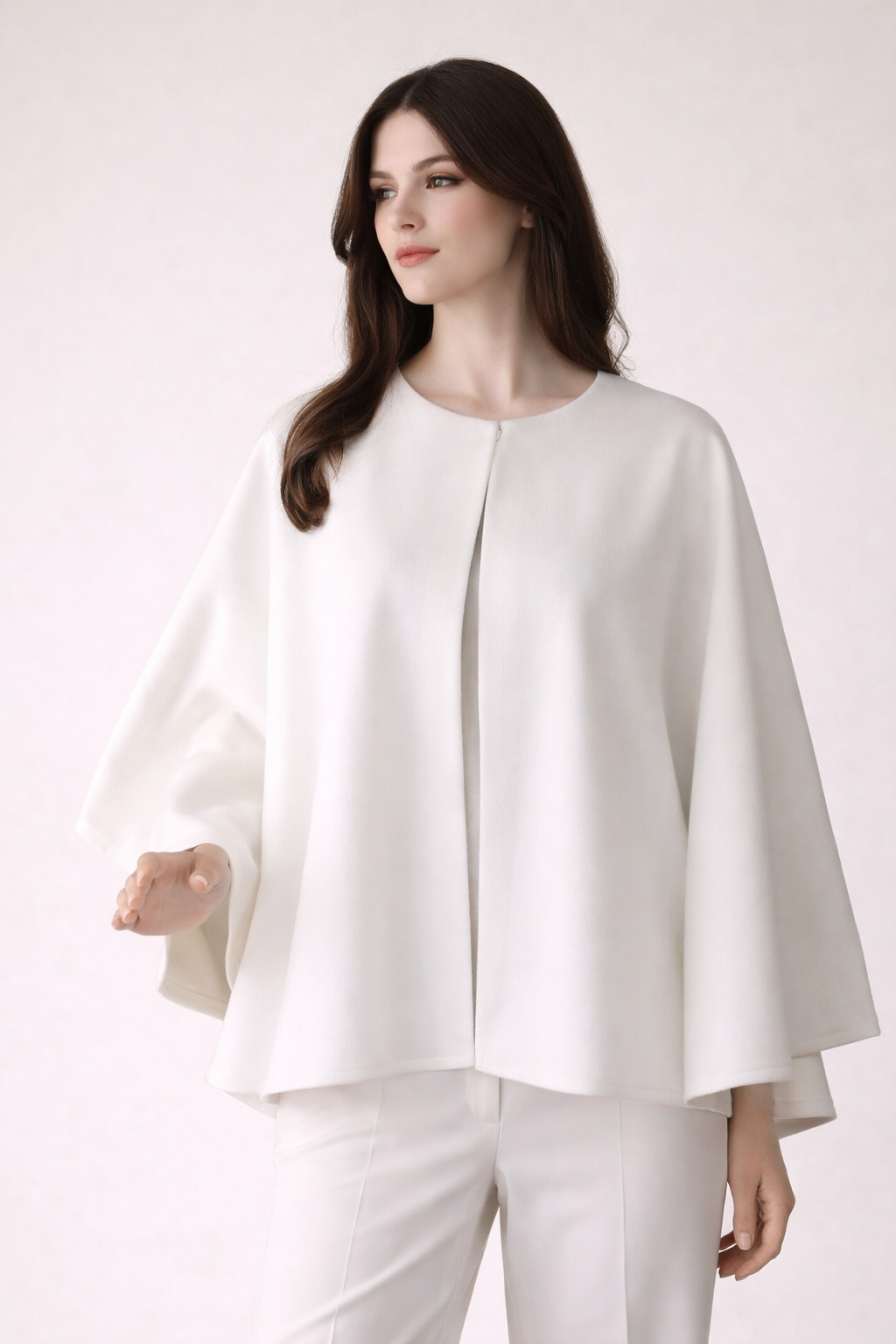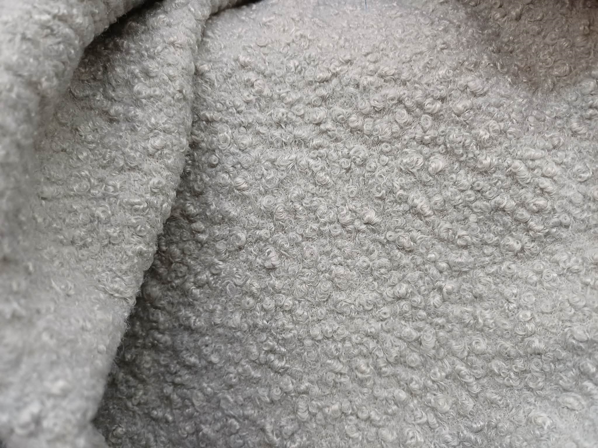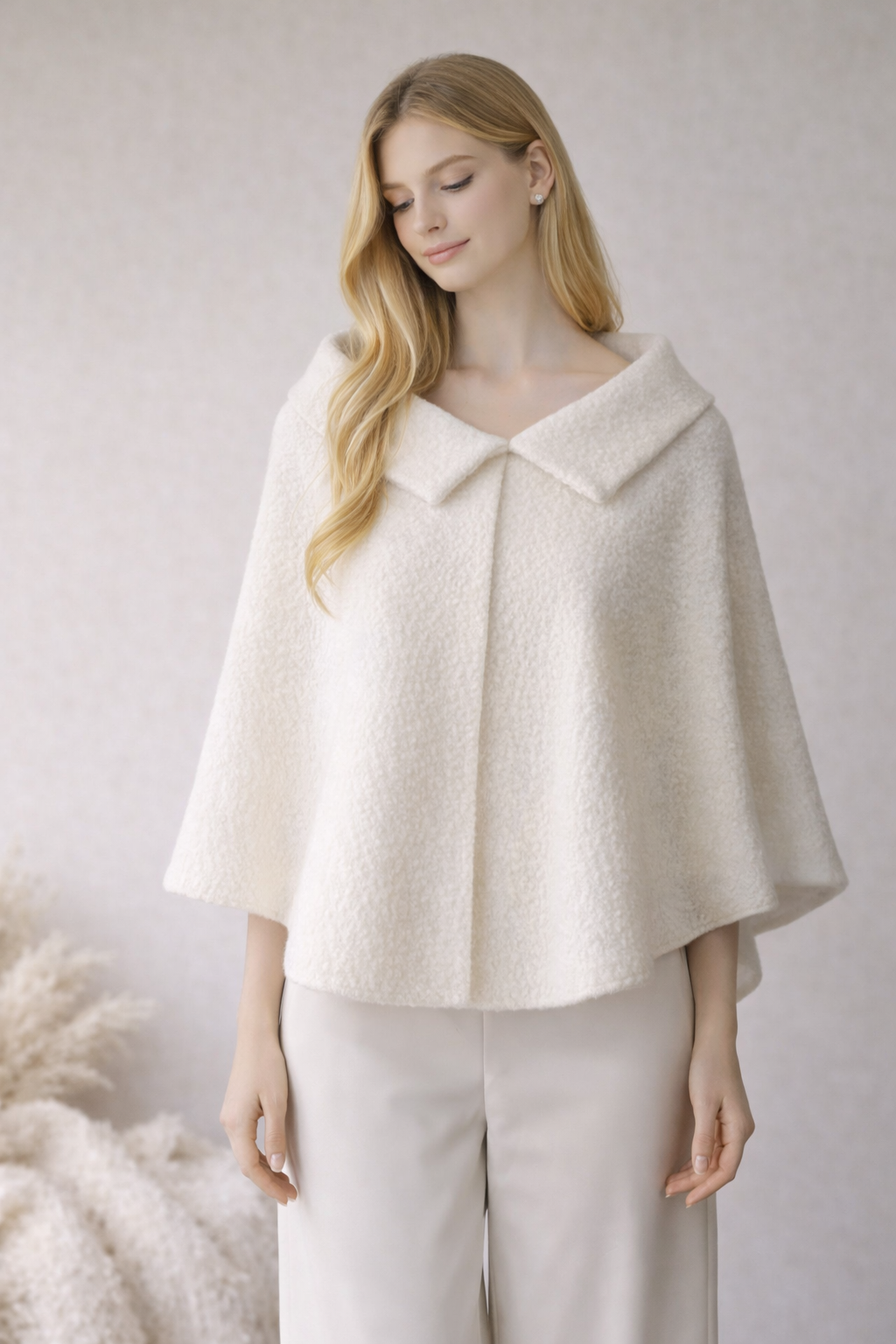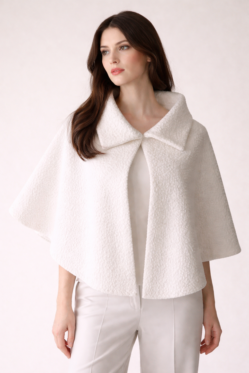 Pelerynka uszyta jest z tkaniny typu boucle.