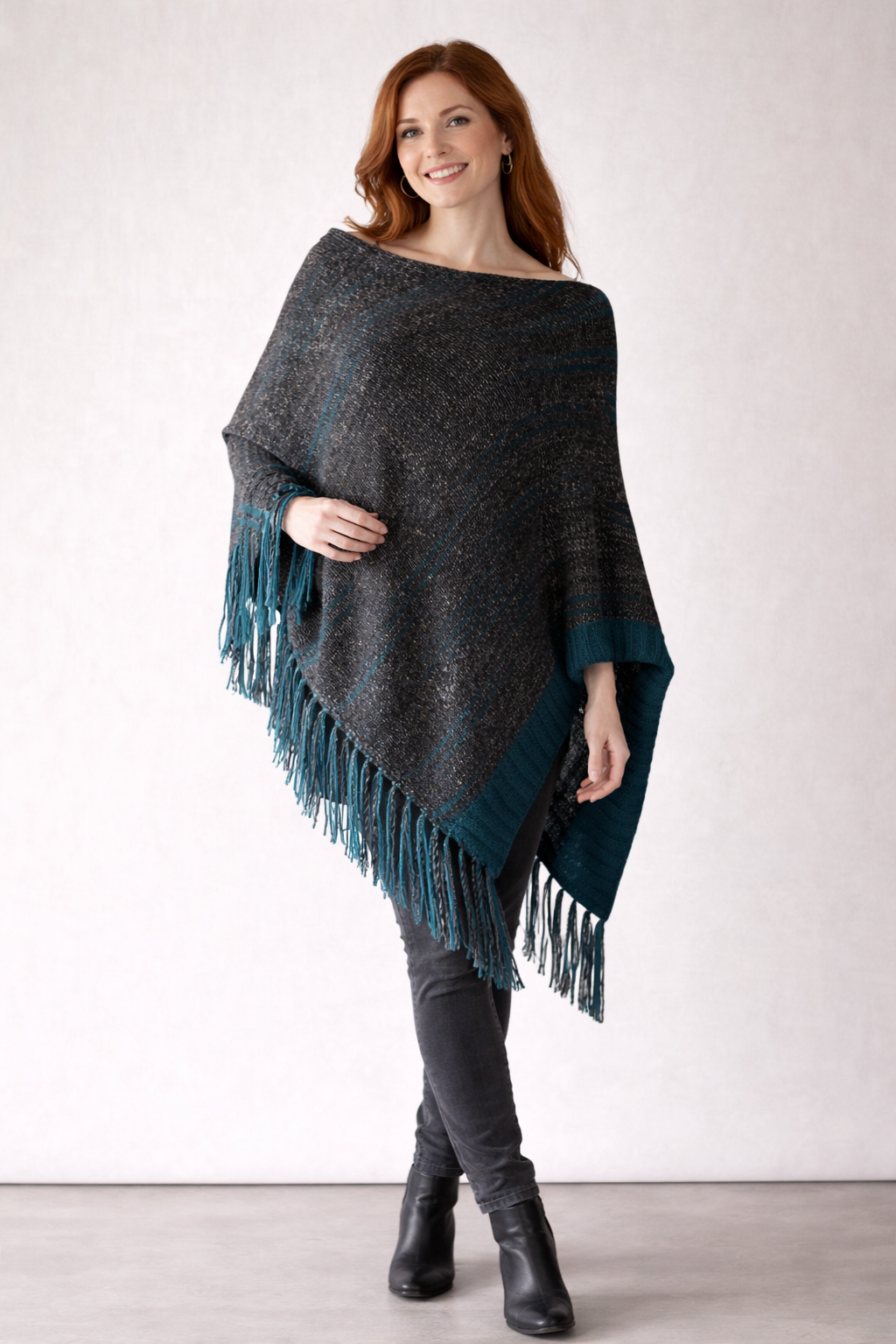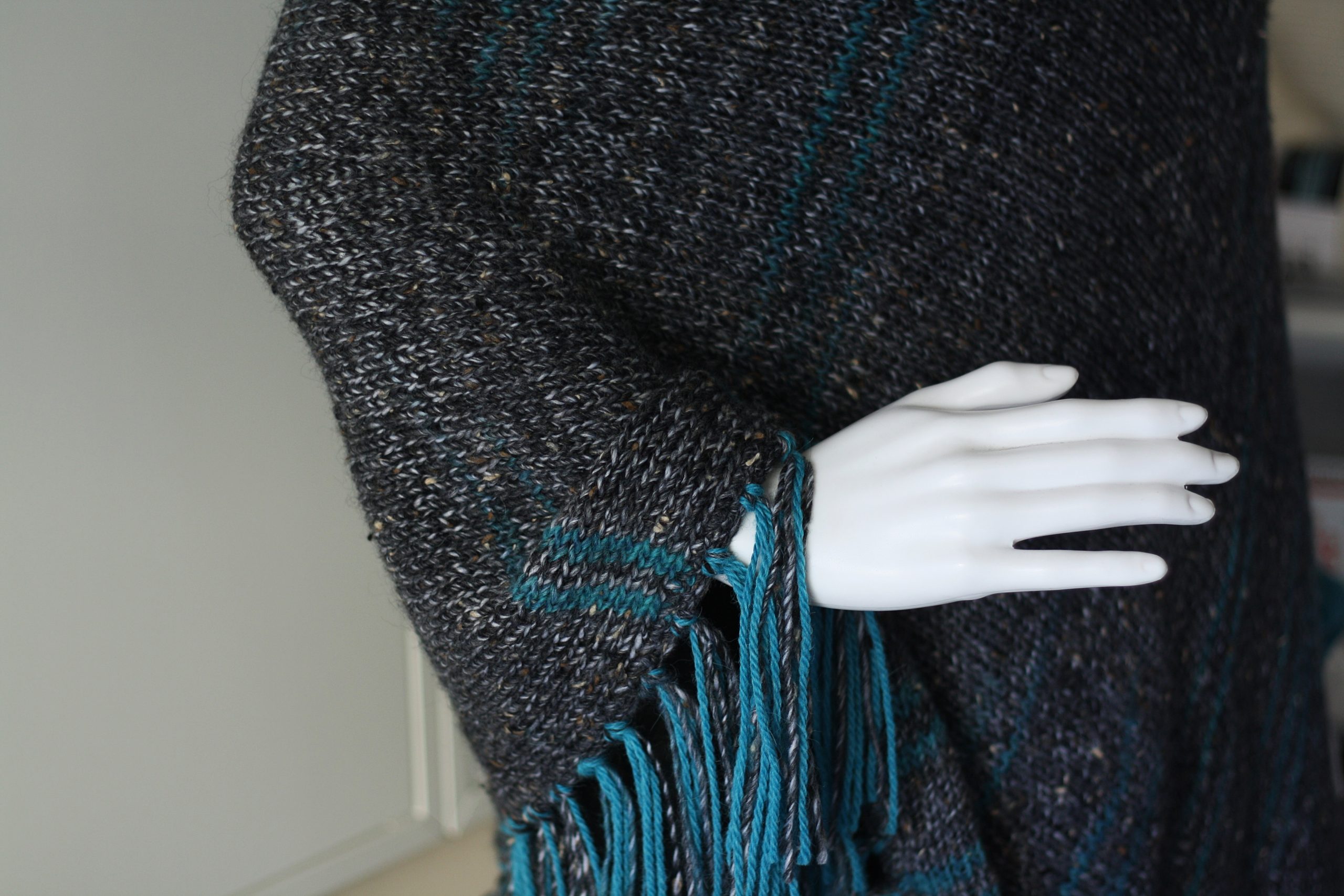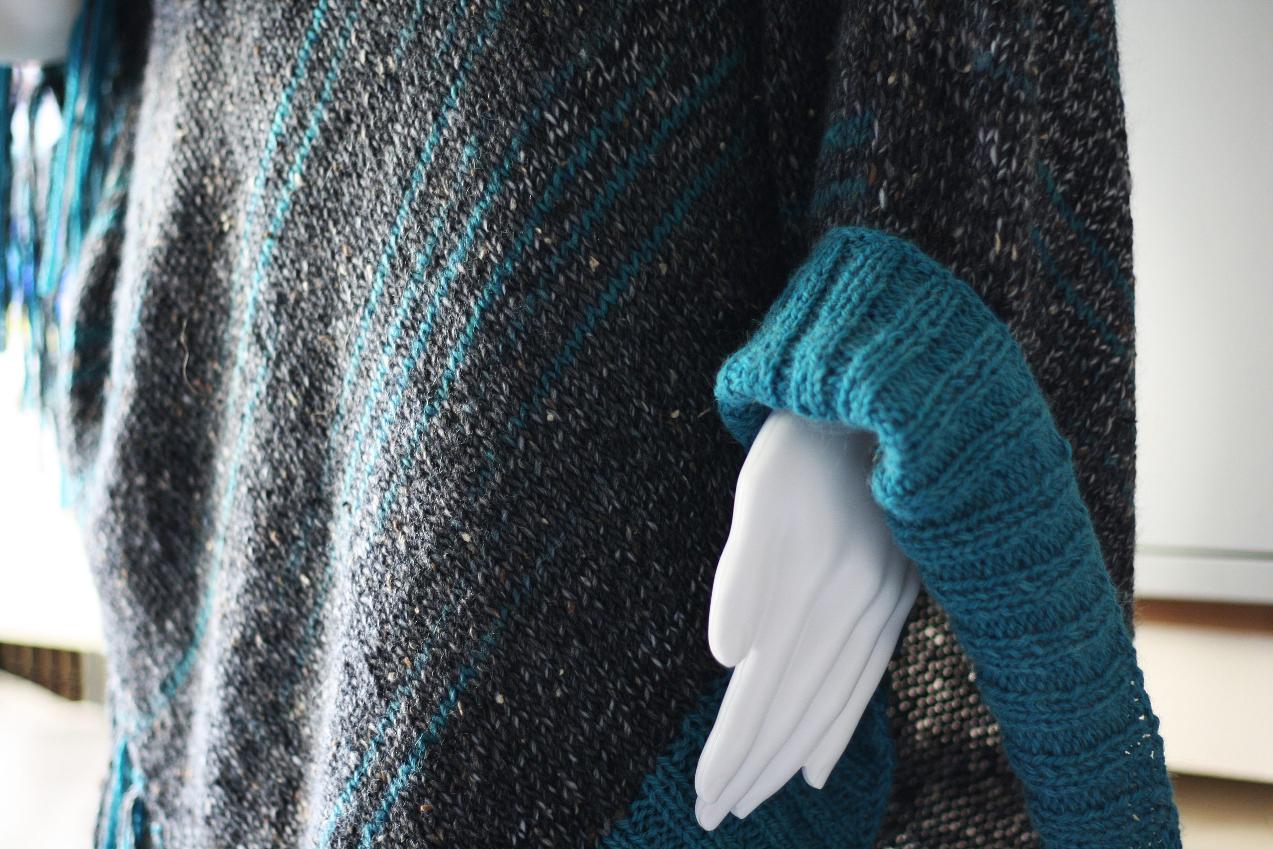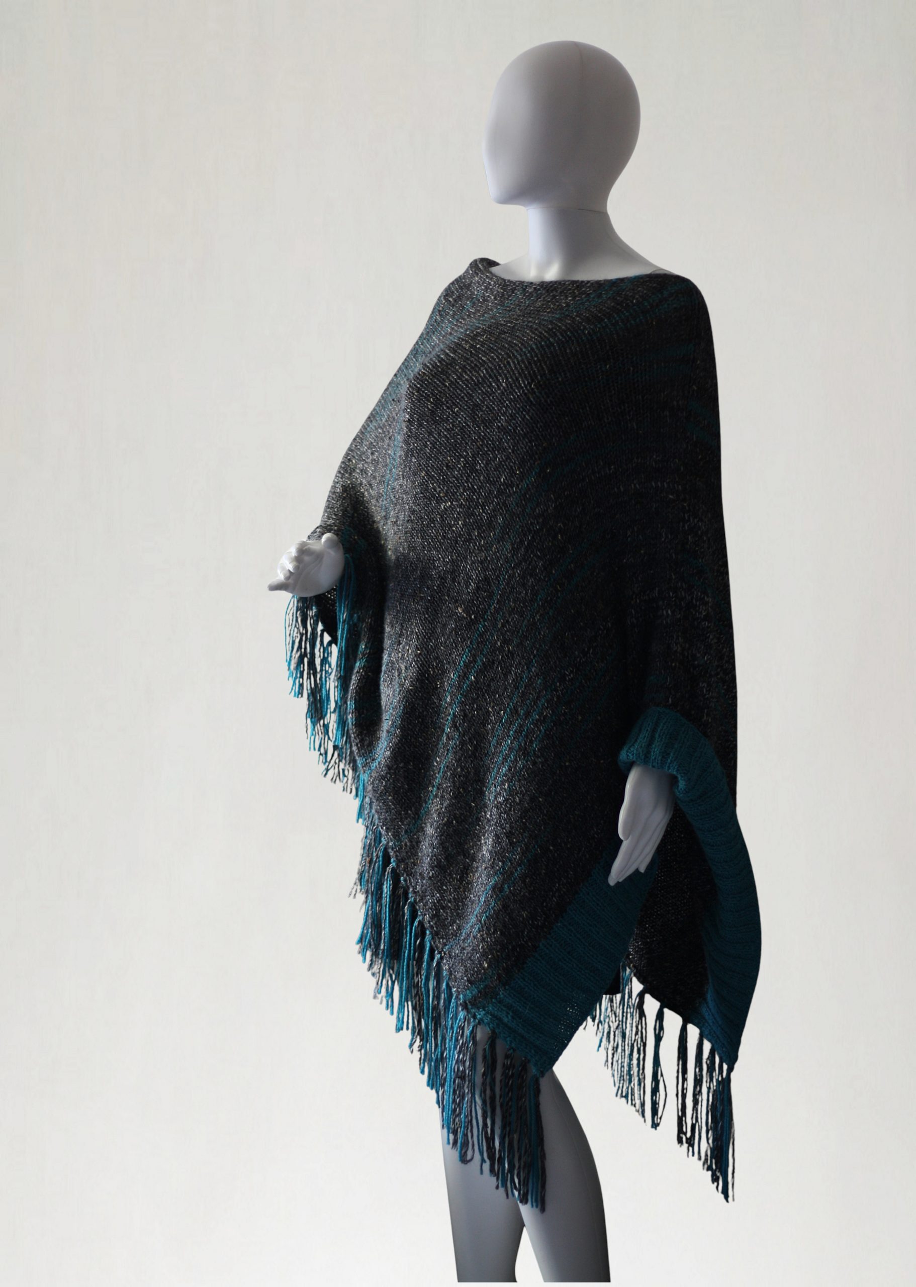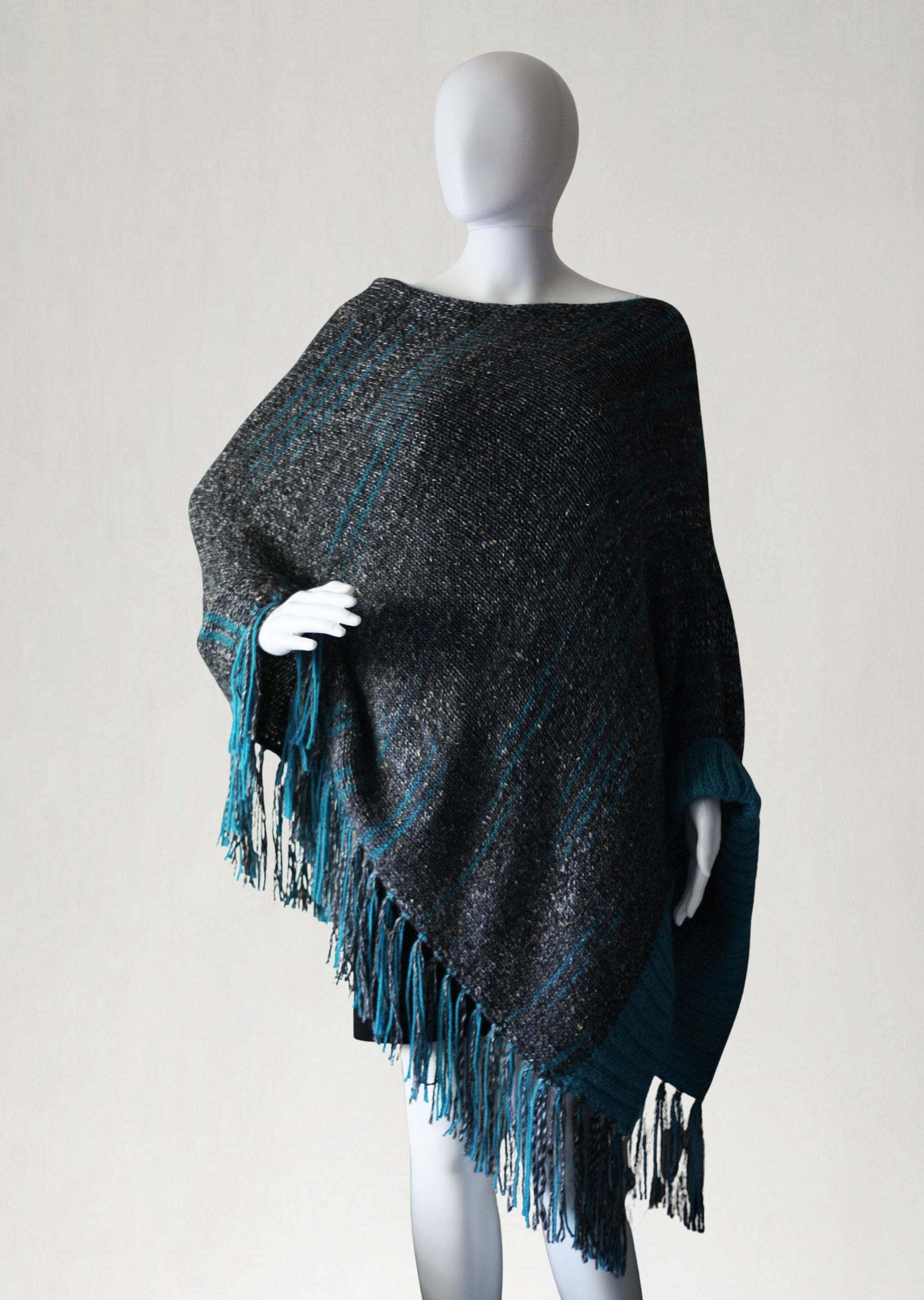 Poncho wykonane na manualnej maszynie dziewiarskiej z alpaki, wełny i wiskozy.