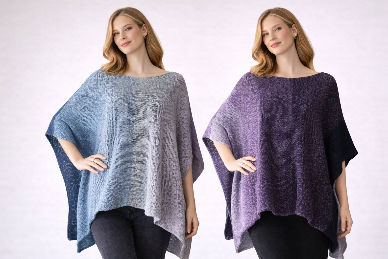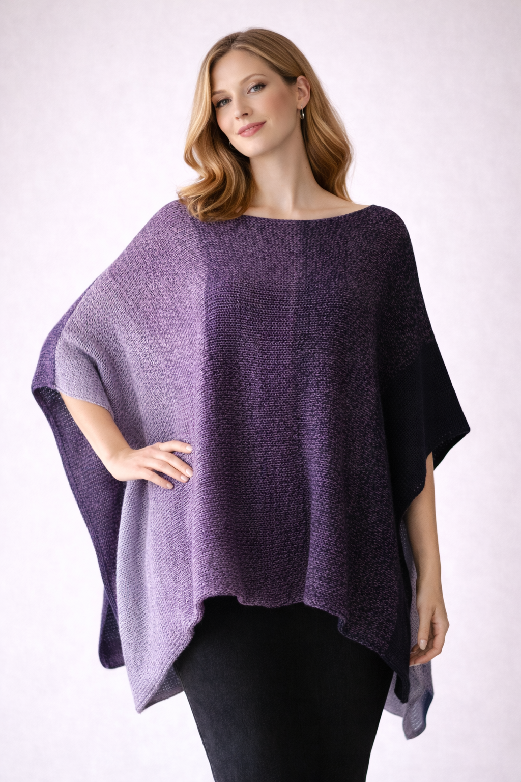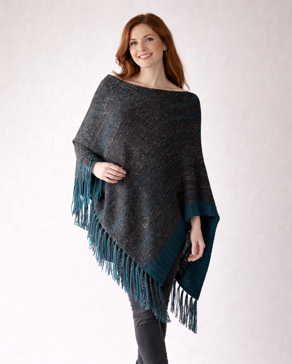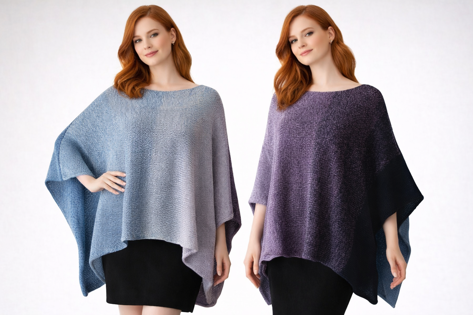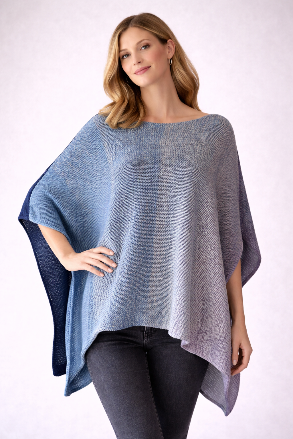 Poncho w fasonie asymetrycznym, wydziergane na manualnej maszynie dziewiarskiej z mieszanki bawełny i akrylu.