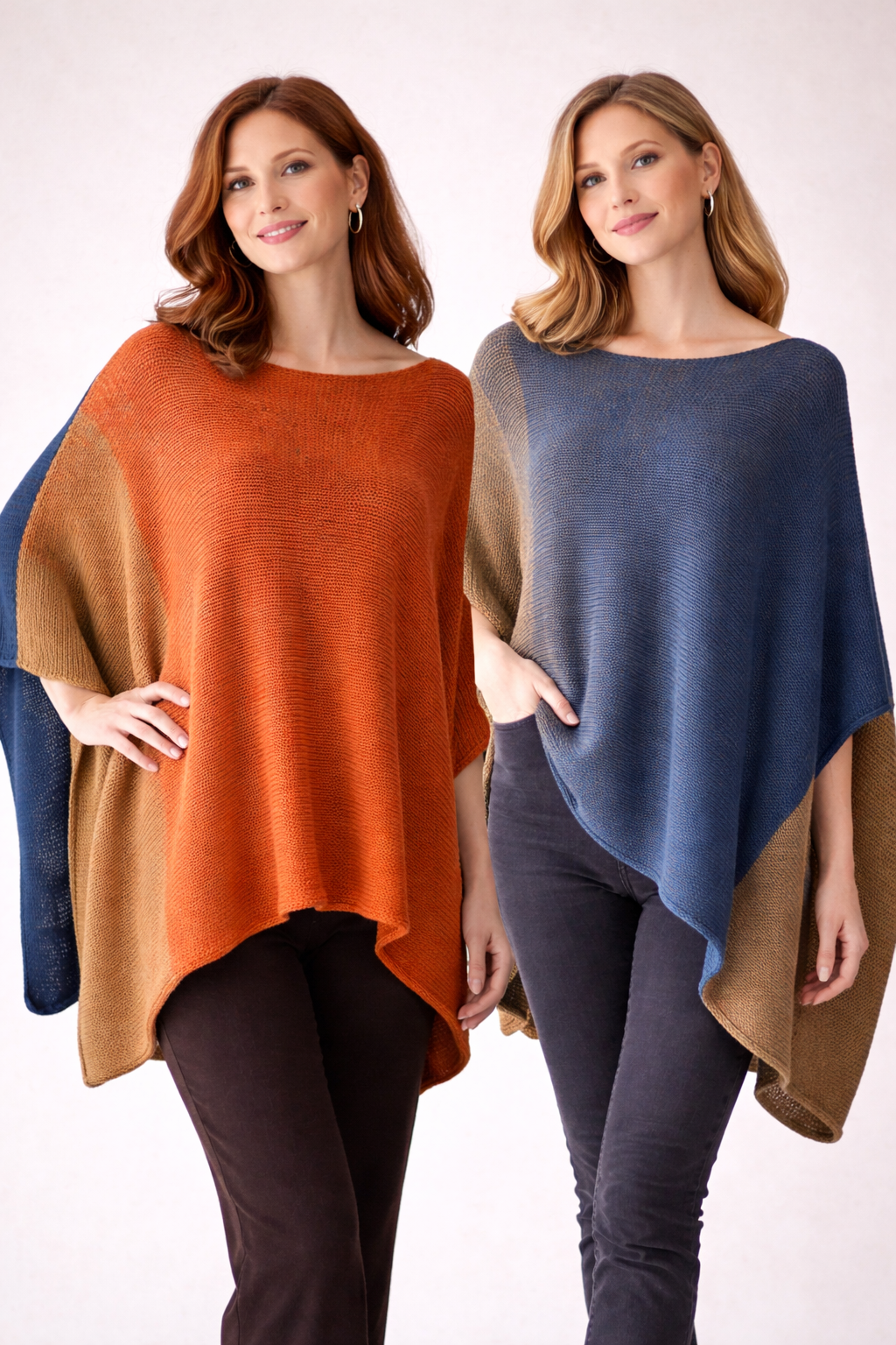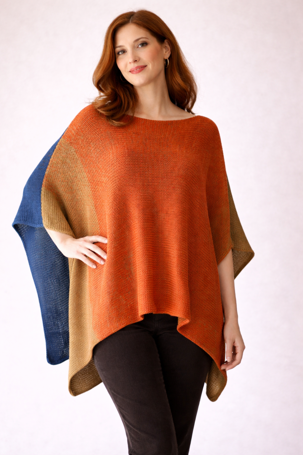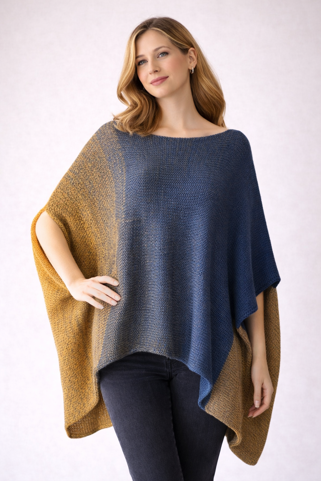 Poncho w fasonie asymetrycznym, wydziergane na manualnej maszynie dziewiarskiej z mieszanki bawełny i akrylu.