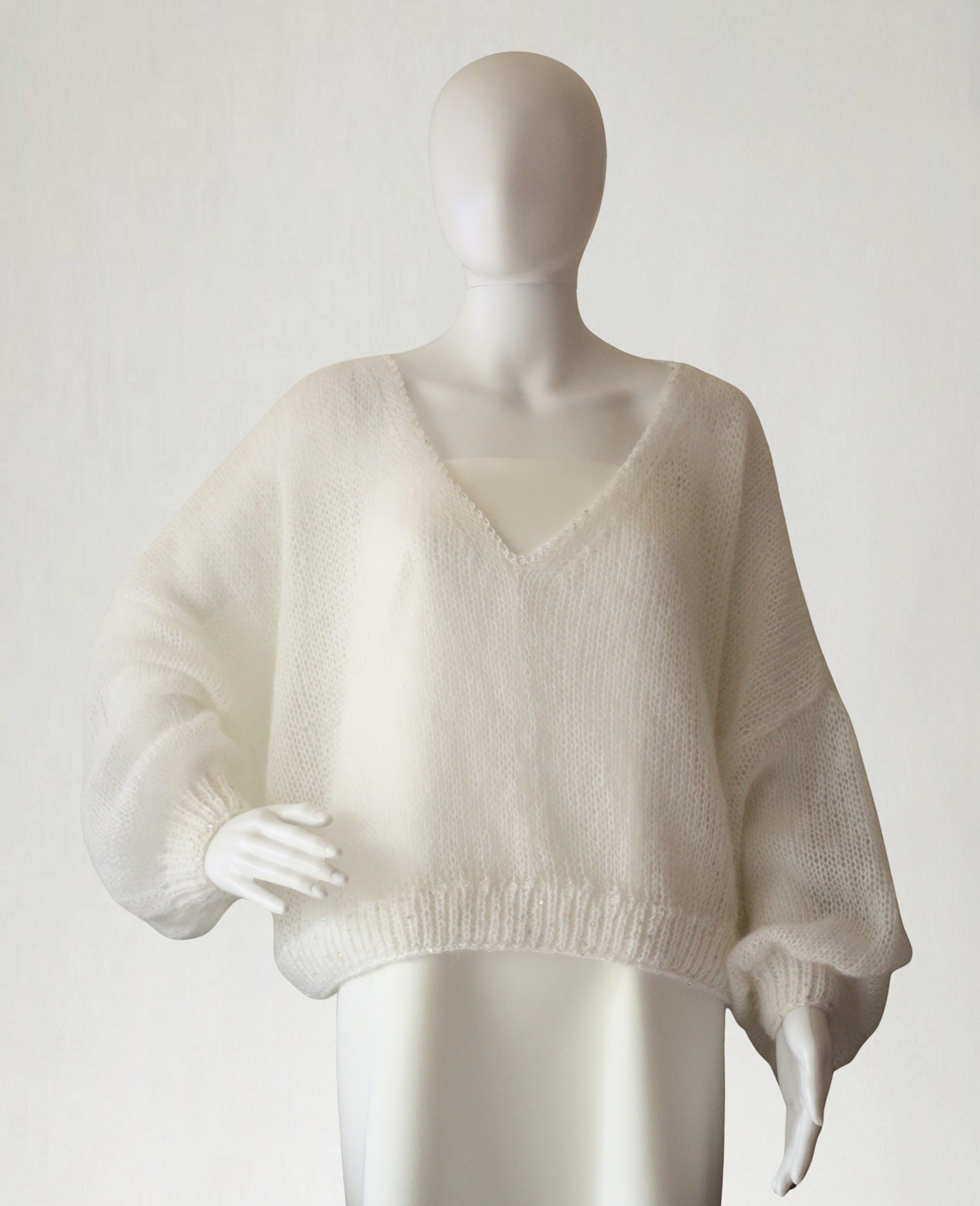 Sweter został wydziergany na manualnej maszynie dziewiarskiej, natomiast ściągacze i plisę, z dodatkiem fantazyjnej nitki z cekinami, wykonano ręcznie na drutach– to właśnie te akcenty sprawiają, że każdy egzemplarz jest tak wyjątkowy.